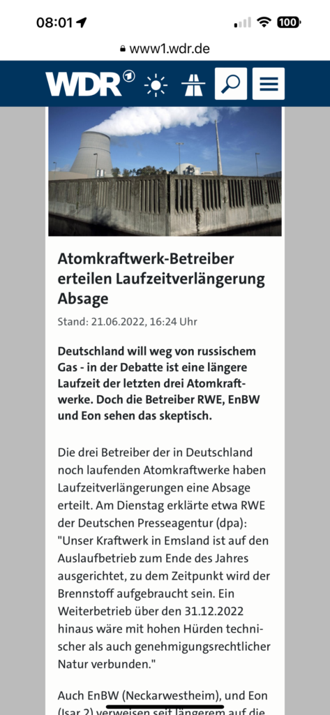 —> Der Ausstieg aus der #Atomkraft wurde von Euch gemeinsam mit der #FDP beschlossen, nachdem Ihr einen Beschluss von Rot/Grün abgewickelt habt. Nach dem hätten die letzten Anlagen 2022 vom Netz gehen sollen. Das ursprüngliche Konzept von hätte einen Weiterbetrieb bis zu 2025 möglich gemacht.