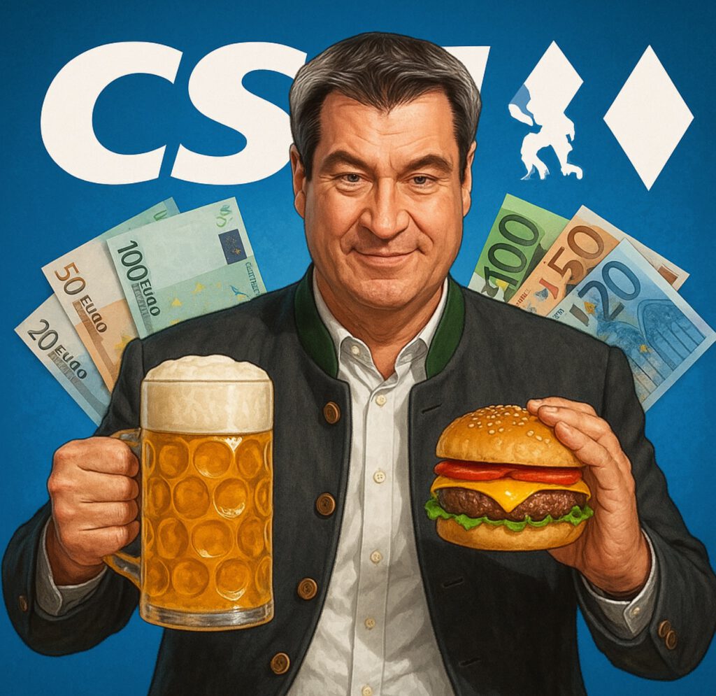 Markus Söder (CSU) für Mehrwertsteuersenkung in der Gastronomie und , Lobby DEHOGA und Fleischlobby- besonders interessant für MC Donald & Co.: Populistischer geht es nicht mehr (Bild KI-generiert)