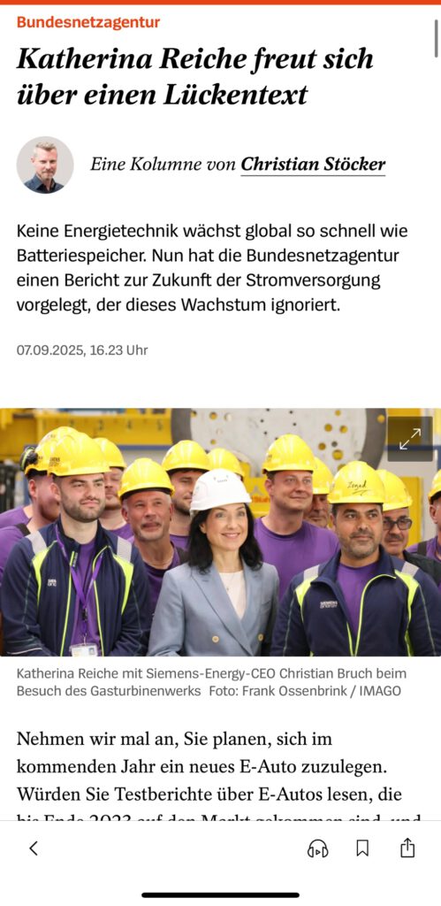 Genau das will Katherina Reiche aber augenscheinlich unbedingt. Nichts wächst im Energiebereich global so schnell wie Batteriespeicher.